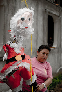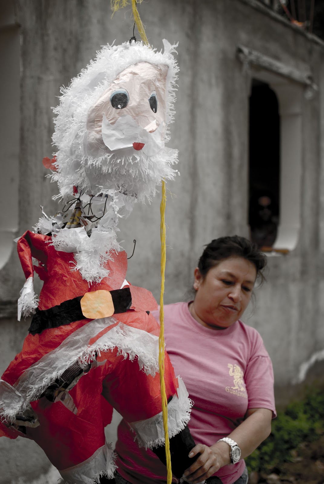W międzyczasie, gdy ponche dochodziło do siebie na palenisku przygotowanym w szkolnym ogrodzie, my poznawaliśmy inne gwatemalskie zwyczaje. Już wcześniej o niektórych czytałam, ale nawet nie sądziłam, że uda mi się w którymś z nich wziąć udział osobiście. „Pinata” to akurat urodzinowy zwyczaj. Tak nazywa się lalka, którą wypełnia się słodyczami. Zadaniem solenizanta oraz jego gości jest rozbicie lalki za pomocą kija. Oczywiście sprawa nie jest taka prosta, bowiem solenizantowi, który zawsze zaczyna całą zabawę, dla utrudnienia zawiązuje się oczy, a ponadto dla zatracenia orientacji obraca się nim w kółku albo tyle razy, ile kończy właśnie lat, albo tyle, ile solenizant sobie zażyczy. Lalka przyczepiona jest na sznurku, za którego drugi koniec trzyma osobą, sterująca nią. Pinatę uderza się do momentu, aż wypadną z niej wszystkie słodycze, na które rzuca się rozwrzeszczany tłum. Wprawdzie przez cały czas dokumentowałam całą akcję, ale w lizaki i cukierki i tak udało mi się trochę obłowić.