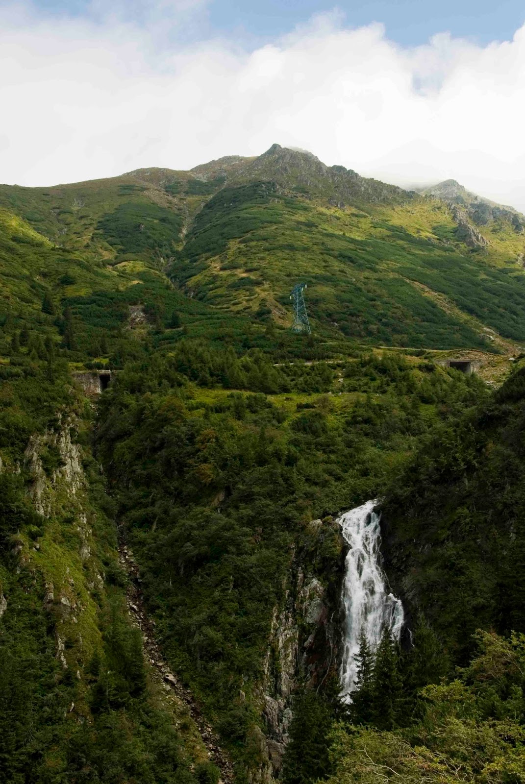 Idziemy. Przed nami jakaś parka z Rumunii. Zaczepia ich rodak i tłumaczy coś po rumuńsku. Gdy parka odchodzi, ja zaczepiam z kolei ich rodaka, prosząc by powtórzył nam to samo po angielsku. Dostajemy wskazówki, że mamy podążać za niebieskim trójkątem cały czas w górę, około 2 km. I okazuje się, że trasa transfogaraska ta najbardziej widokowo dopiero zaczyna się wyżej. Kombinujemy, że może, gdy wejdziemy na szczyt blisko wodospadu uda nam się przedostać prosto na drogę i tam złapać stopa, zamiast schodzić z powrotem w dół. Wspinamy się. Ja jestem w siódmym niebie. Ci, co mnie znają lub czytają blog od początku mojej podróży do Ameryki Środkowej wiedzą jak bardzo lubię chodzić po górach. Przez chwilę zapominam, że Agnieszka idzie ze mną i próbuje dotrzymać mi kroku. Powinnam była już na początku ją uprzedzić, by za mną nie goniła, tylko szła w swoim tempie. Jej płuca palacza nie dają sobie rady.