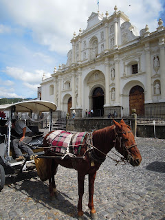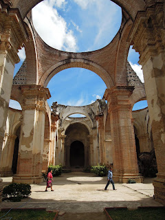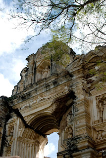 W drodze ze wzgórza, minęłam malutki, ale niezwykle urokliwy skwerek z fontanną, wprawdzie nieczynną, ale miejsce i tak jest bardzo sympatyczne, a chwilę potem po prawej stronie objawiły mi się ruiny Iglesia de la Candelaria. W ogóle w Antigule jest masa ruin, majestatycznych i pięknych – to pozostałości po silnych trzęsieniach ziemi, które nawiedziły Gwatemalę.