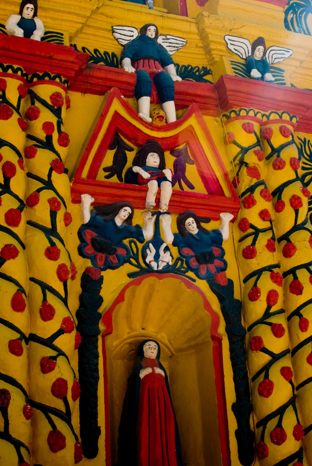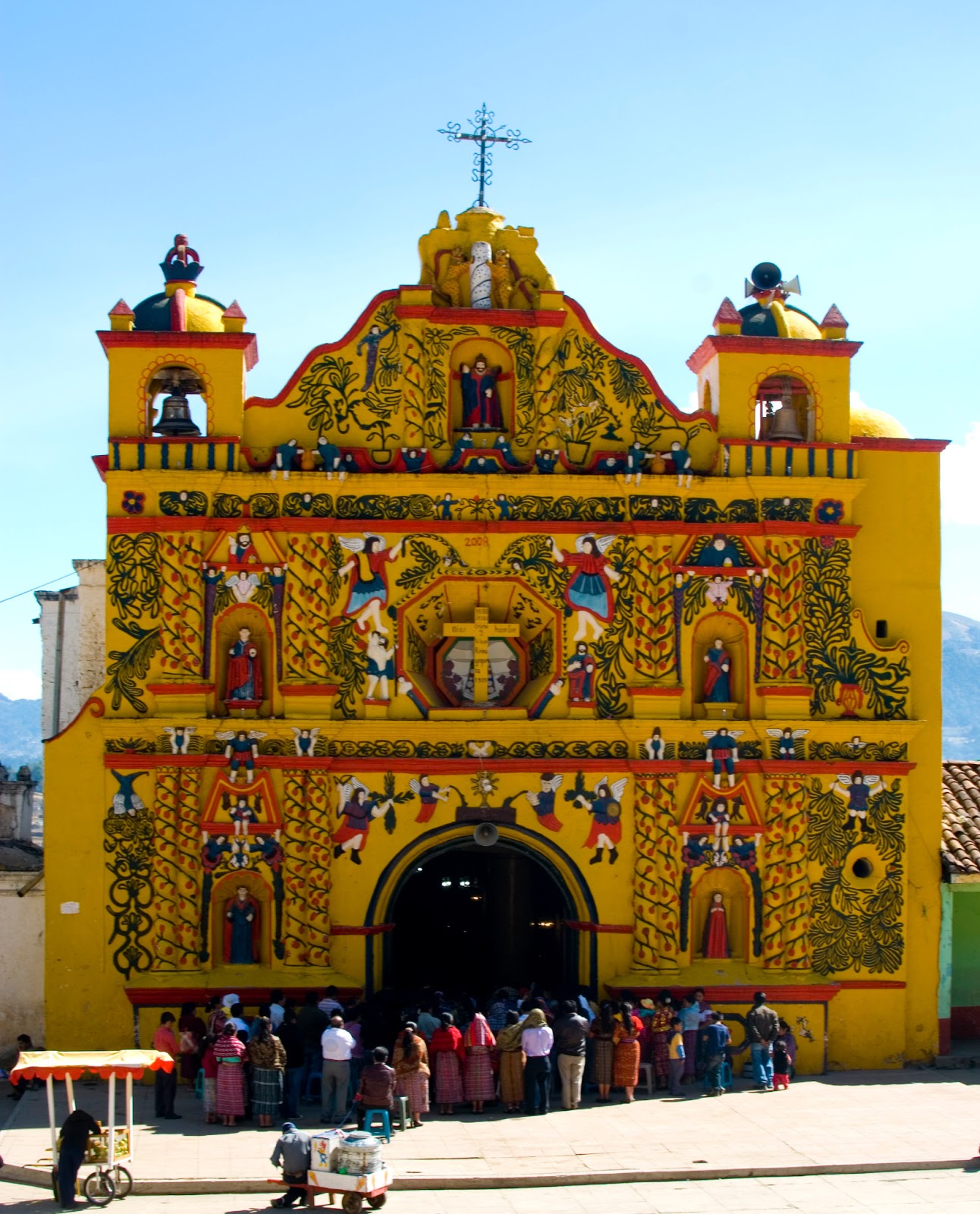 Miasteczko słynie z niezwykłego kościoła. Już z daleka, gdy dobijałam do brzegów, niemal oślepiła mnie już z daleka żółta budowla. Okazało się, że to właśnie ów, poszukiwany przeze mnie kościół, ozdobionego licznymi barwnymi kwiatami, pnącymi się winoroślami i równie kolorowymi figurami aniołów. Niebieski, czerwony i żółty to ulubione kolory tego świętego przybytku. Oczywiście miałam fantastycznego pecha, o ile pech może być fantastyczny, ponieważ idealnie dotarłam do miasteczka z chwilą rozpoczęcia się, trwającej prawie dwie godziny mszy.