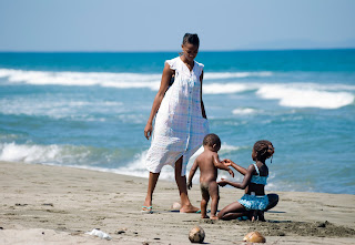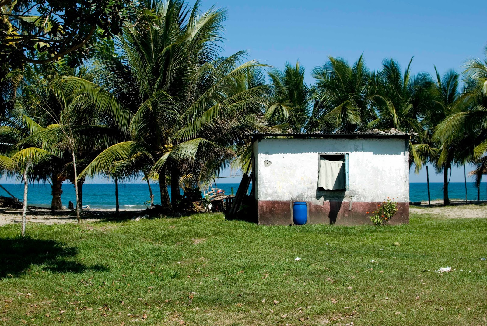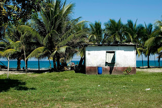 A ja tymczasem znalazłam się w raju dredowo-warkoczykowym. Wszystkie dziewczyny miały przepięknie zaplecione warkoczyki, a z nich posplatane finezyjne fryzury, aż mnie ścisnęło z zazdrości. W autobusie poczułam się naprawdę bezpiecznie. W tle leciała muzyczka reggae, a nie jak we wszystkich camionetach gwatemalskie lub hondureńskie disco-polo. Dawało się odczuć pozytywne wibracje. I tu ma być niebezpiecznie, pomyślałam tylko. Dojechałam do wioski. Cisza, spokój, błękit morza i nieba, złocisty piasek na plaży. Sielanka. Brak turystów i tylko sami miejscowi, chowający się w cieniu palm przed, lejącym się z nieba, żarem. Każdy się kłaniał, pozdrawiał i życzył miłego dnia, życzliwie się uśmiechając.