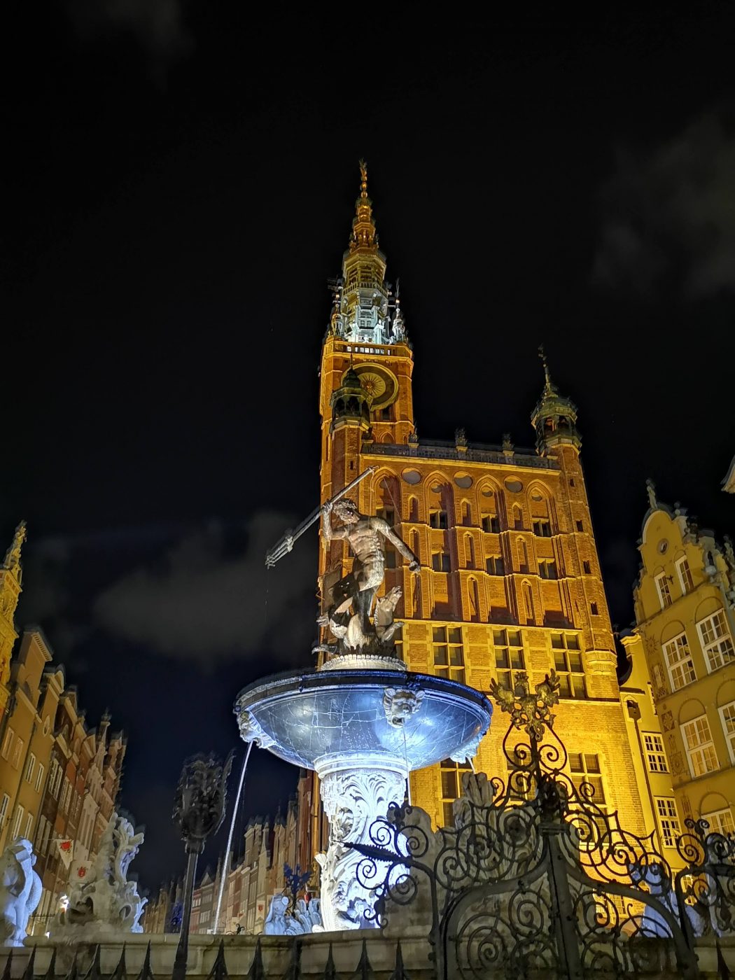 Docieram w końcu na ulicę Długą, która dawniej była traktem prowadzącym do przeprawy, a dalej do Prus. To była przez wieki najważniejsza ulica Gdańska i tak jest w sumie do dziś. Podchodzę do fontanny Neptuna, która jest kolejnym charakterystycznym elementem miasta, świetnie przez wszystkich rozpoznawanym. Bardzo atrakcyjnie wygląda na tle podświetlonego Ratusza i granatowego jeszcze nieba.