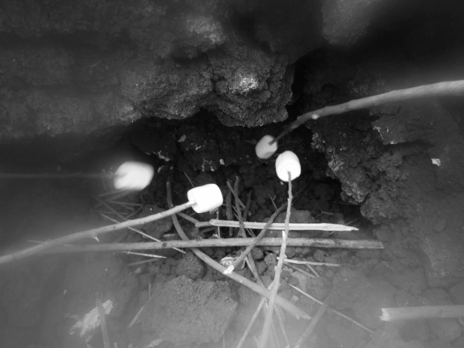 Powiódł nas w miejsce, w którym na patykach mogliśmy upiec sobie pianki marschalla, a miał ich całkiem sporo w plecaku. W jednym z miejsc niedaleko szczytu, z głębi skał wydobywało się przyjemne ciepełko i to tam urządziliśmy sobie „ognisko” i pieczenie pianek. Miło było też się tam po prostu ogrzać, bowiem przez mgłę i wicher, zimno na górze zrobiło się okrutnie.