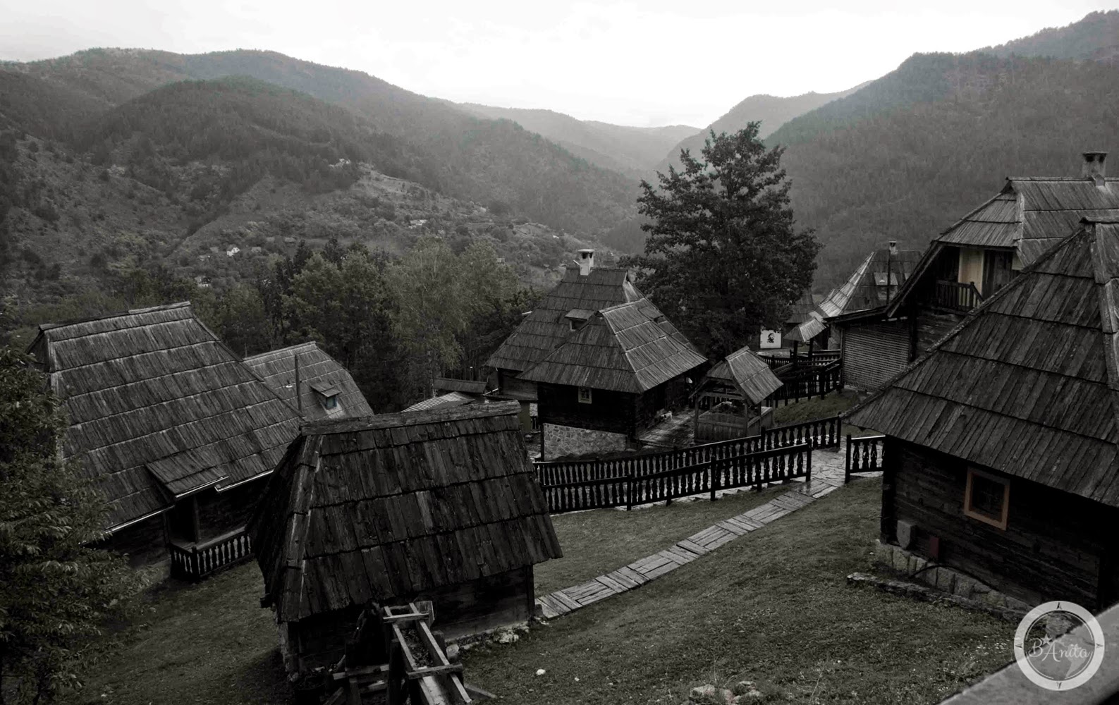 Po przerwie na kawę, do której zostałyśmy zmuszone, zabraniu kolejnej autostopowiczki, łaskawie postanowili nas podrzucić do „Disneylandu” Emira Kusturicy. Skąpane w mgle i otoczone wilgocią drewniane domki ze spiczastymi dachami wyglądały zagadkowo. Pożegnałyśmy się z naszymi towarzyszami i ruszyłyśmy na zwiedzanie drewnianego miasta. W momencie, gdy kupiłyśmy bilet wstępu, nastąpiło ponowne oberwanie chmury. Ukryłyśmy się w jednej z knajpek. Poczułam znów ulgę. Chociaż nie miałyśmy pojęcia, gdzie będziemy spać i czy w ogóle znajdziemy jakieś niedrogie miejsce do spania w tej małej mieścinie, to czułam się bezpiecznie.
